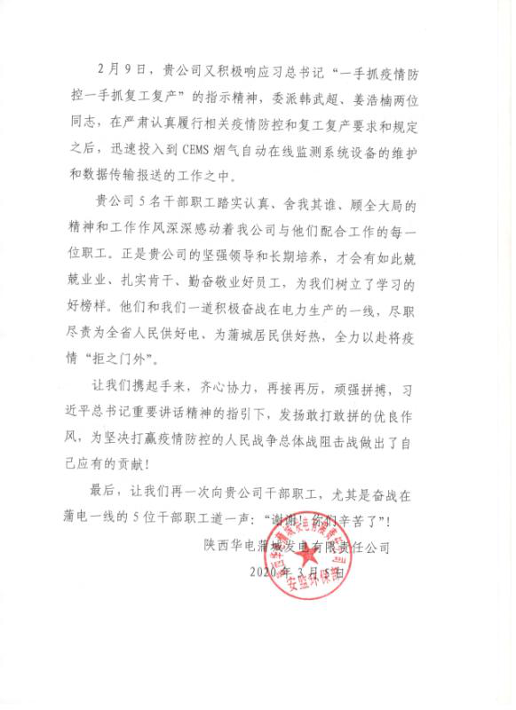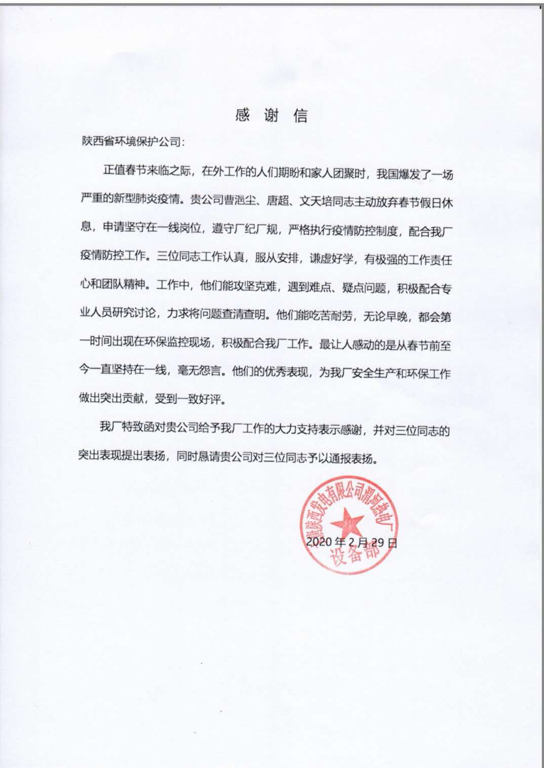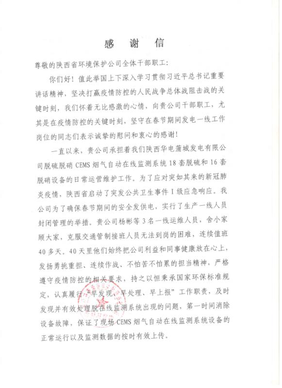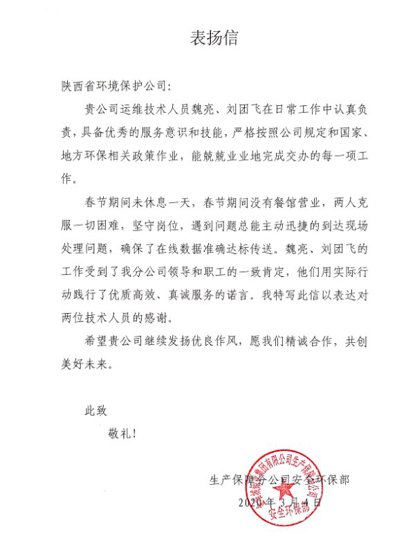 为打赢疫情防控阻击战,环保公司自疫情发生以来,积极响应集团公司党委号召,一手抓防疫,一手抓生产,全力以赴投入到战疫情、保运维的工作当中,保障了全省23家企业194套污染源在线监测设备、30余个水质自动监测站数据的稳定有效上传,同时延安甘谷驿甲醇污水处理、天蓝公司延安南区供热、垃圾填埋场渗滤液处理等民生项目安全稳定运行,有力展示了国企担当,履行了社会责任。连日来,陆续受到省生态环境厅、各地市生态环境局和服务企业的表扬认可。大唐陕西发电公司渭河热电厂、陕西华电蒲城发电公司、金堆城钼业集团等企业,纷纷向环保公司发来感谢信,充分肯定环保公司运维团队攻坚克难、团结协作、锐意进取的企业精神和想客户之所想、急客户所急的服务理念。