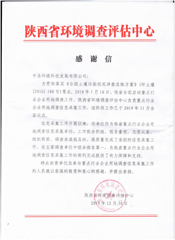 日前,中圣公司被陕西省环境调查评估中心授予“陕西省重点行业企业用地调查信息采集优秀技术支撑单位”称号。