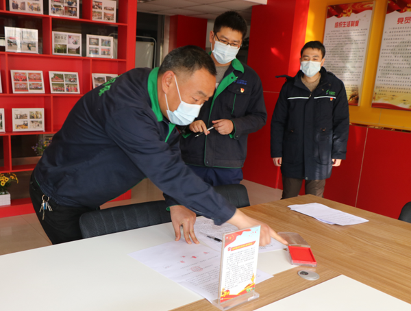 他们在“请战书”上按上了鲜红的手印,从每名党员的身上散发着高昂的斗志和战胜疫情,确保年度任务完成的信心和勇气。疫情防控排查、消毒、测温、扫码登记,现场任务安排,每个角落都能见到一面面鲜红的旗帜。